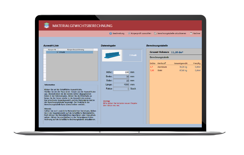 Keine manuellen Berechnungen mehr. Ermitteln Sie das Gewicht von Profilformen und Materialien schnell und effizient in dieser Software. Einfach Profil wählen, Maße eingeben, fertig. Kompatibel mit Windows 10, 11, Access 365 (32 oder 64 bit).